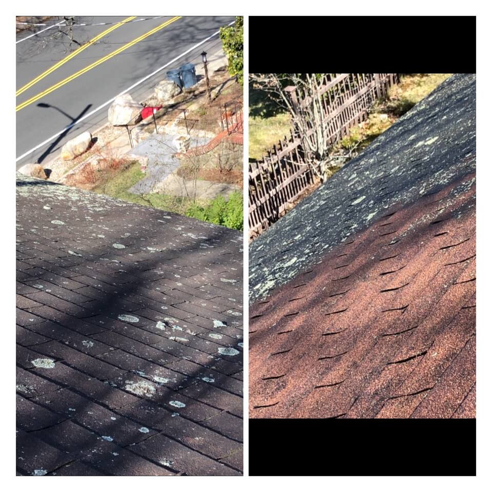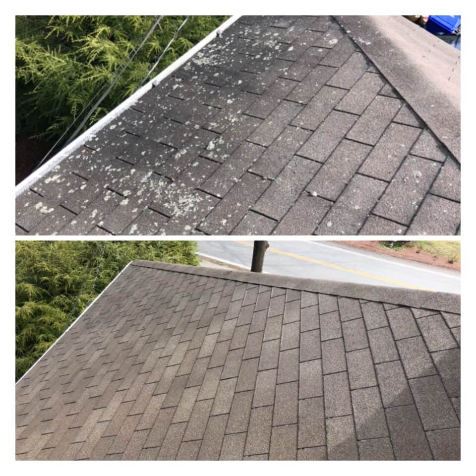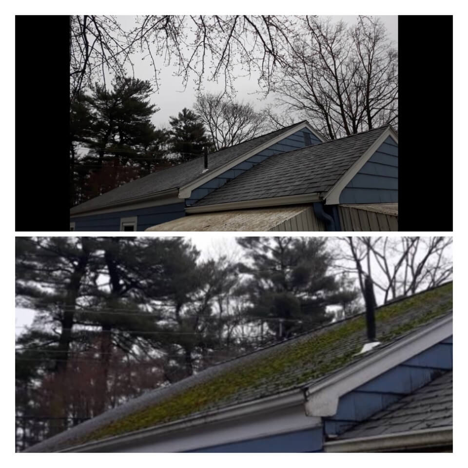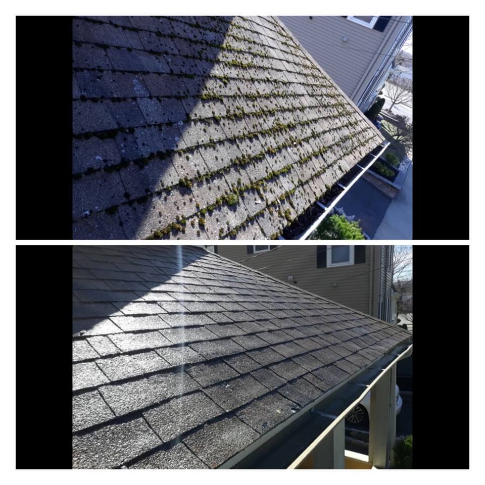 HiCleaners is the most experienced company in Hamilton, MA that deals with roof washing and roof soft washing. All of our employees are trained to recognize precise solution mixing ratios to provide you with the safest and most effective soft washing service. Roofs are a commonly neglected part of a house due to the fact that most people don’t have ladders to access it, so it is very easy to just leave it alone and forget about problems that may start to arise. Just like many home owners, discoloration and small bits of moss on a roof can be overlooked because of the misconception that it is just aesthetic. However, it isn’t just aesthetic, the moss slowly lifts the granules off the shingles which in turn shorten the life of the shingle. The moss also spreads, just like any bacteria if it is left alone for too long, it can quickly become a problem that spirals out of control. Call HiCleaners for a free quote, we only use the most advanced eco-friendly solutions and equipment to make sure the job is done right, for the safety of the employees, your plants, grass, pets, and children.
